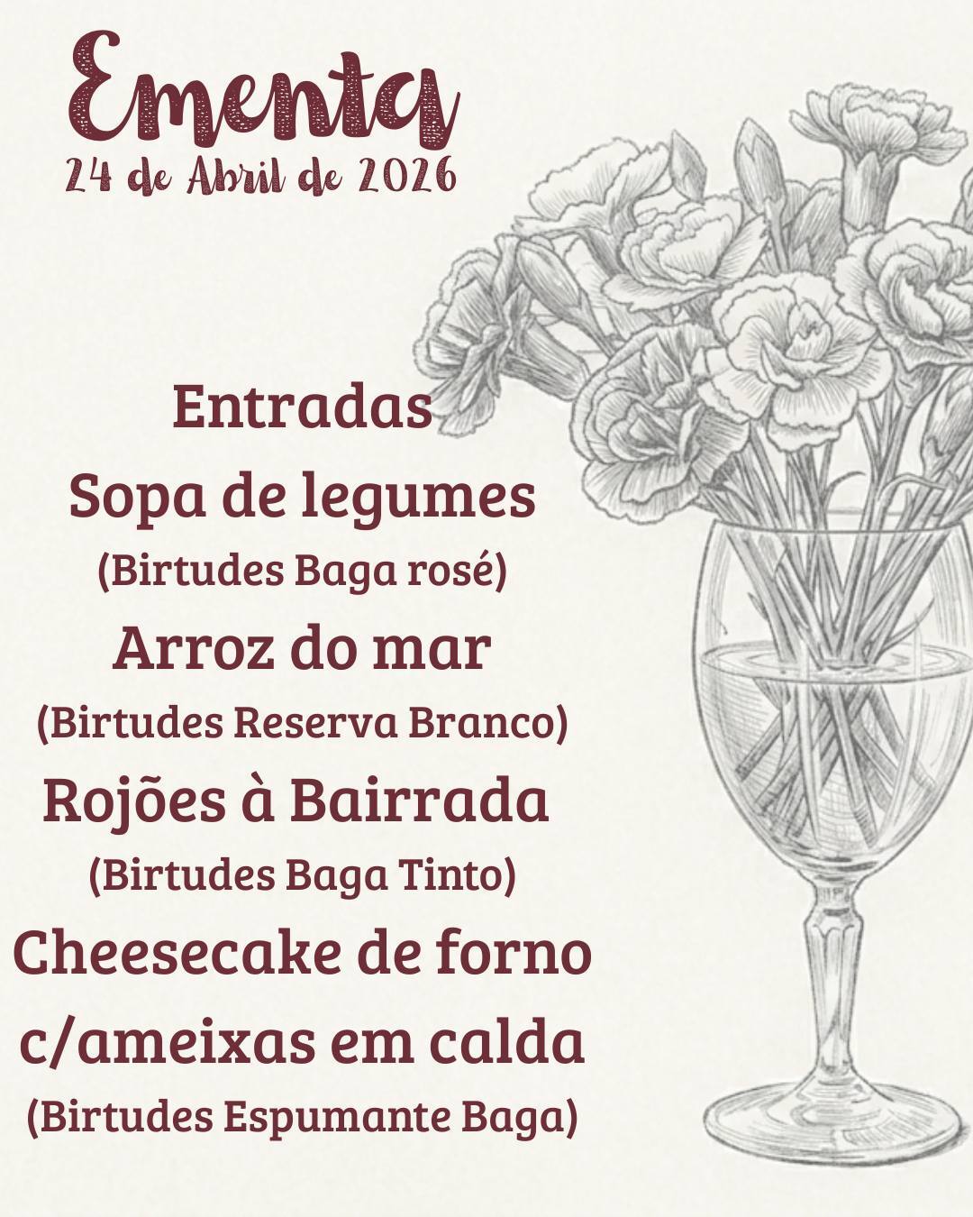 Dia 24 de Abril voltamos a reunir à volta da mesa, para provar bons petiscos acompanhados por bons vinhos!